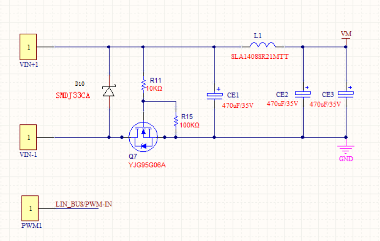 電路模塊主要包括: 輸入防反及濾波電路部分、24V轉(zhuǎn)12V系統(tǒng)供電電路(24V方案)、ADM16F03A2最小系統(tǒng)、功率橋電路、ADC母線電壓采樣電路、單電阻采樣運(yùn)放采樣電路、自舉電路和PWM/LIN通訊反饋電路。