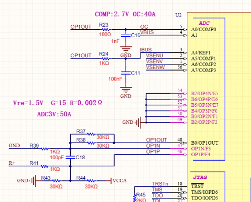 單采樣電阻0.001R/0.002R,通過(guò)差分走線至ADM16的OP1的獨(dú)立運(yùn)放電路進(jìn)行運(yùn)放輸入到芯片口采樣進(jìn)行運(yùn)算。