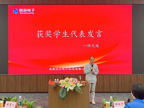 “進(jìn)芯電子獎(jiǎng)學(xué)金”獲獎(jiǎng)學(xué)生代表發(fā)言,他感謝進(jìn)芯電子對青年學(xué)子的支持,感謝學(xué)校對自身的培養(yǎng),表示深耕專業(yè)知識、厚植家國情懷是成才的必經(jīng)之路,他將再接再厲,勇創(chuàng)佳績。